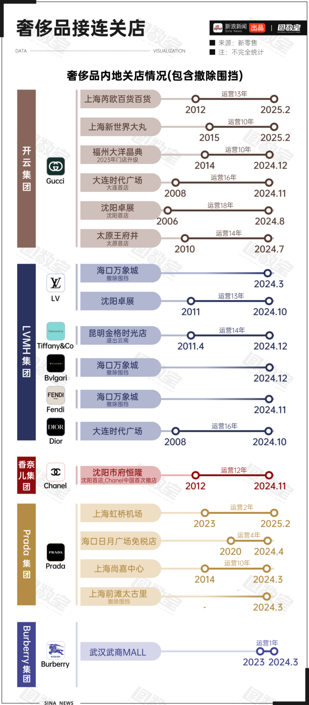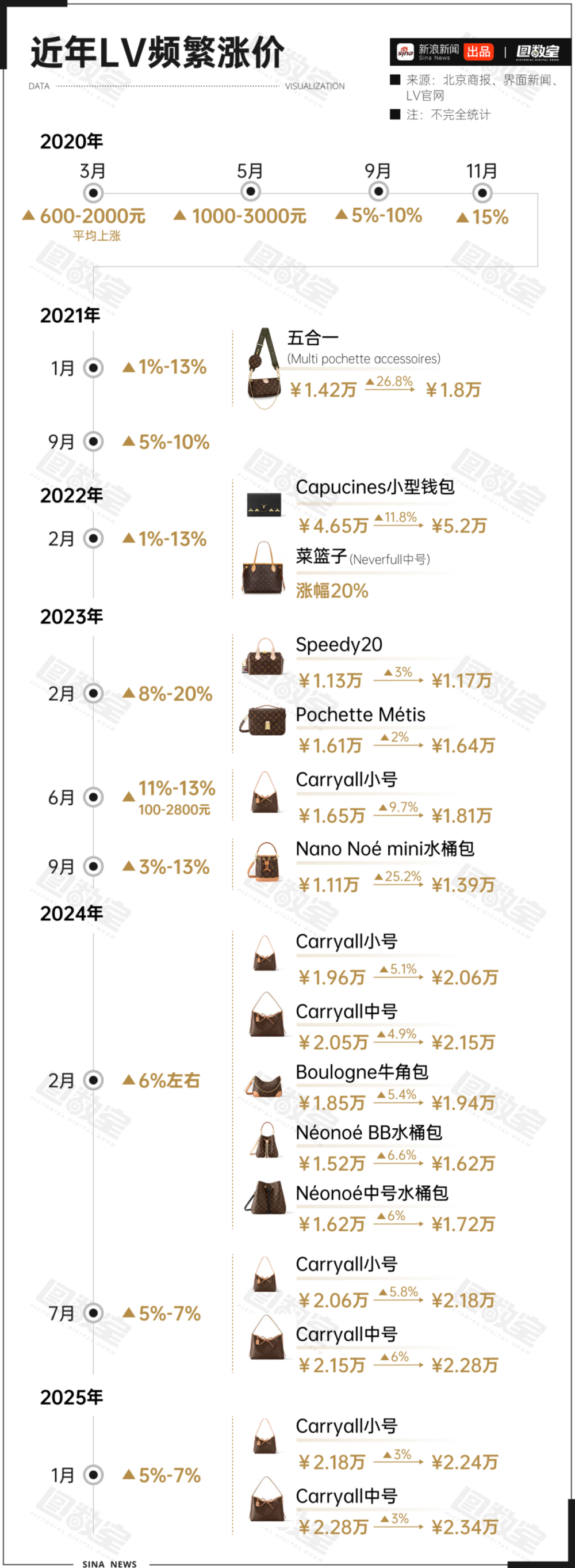 2023年2月,红布林又得到了B+轮的融资,投资方包括58同城等。而在此前,二手奢侈品领域还有胖虎、妃鱼等平台获得渶策资本、五岳资本等的投资。 2024年9月,红布林被转转全资收购。 继奢侈品后,又被二奢收割 数据显示,2024年全球奢侈品行业总销售额降至1.478万亿欧元,同比下滑2%。同时,两年内行业流失了约5000万消费者,占全球高端消费者总数的八分之一。 除了老生常谈的消费降级之外,频繁的涨价可以看作是原因之一。投资研究机构伯恩斯坦公司(Bernstein Research)计算了近年来奢侈品价格的飙升,在2020至2023年间Dior提价66%,Chanel提价59%,Moncler提价54%,Prada提价43%,Louis Vuitton提价31%,Saint Laurent提价25%,Gucci提价21%,Hermès提价20%,而Burberry提价18%。 一方面,频繁的涨价让部分消费者逐渐认识到产品本身的质量与价格不符:之前是溢价,如今是超溢价,所以不想给奢侈品花钱了。另一方面,过高的价格也劝退了曾经会花一些闲钱去买奢侈品的普通消费者和潜在消费者,让他们彻底断了念想。 就拿LV举例,图数室根据公开资料统计,近年LV涨价超10次。涨价如呼吸一样简单,让人高攀不起,那消费者也对它爱答不理。