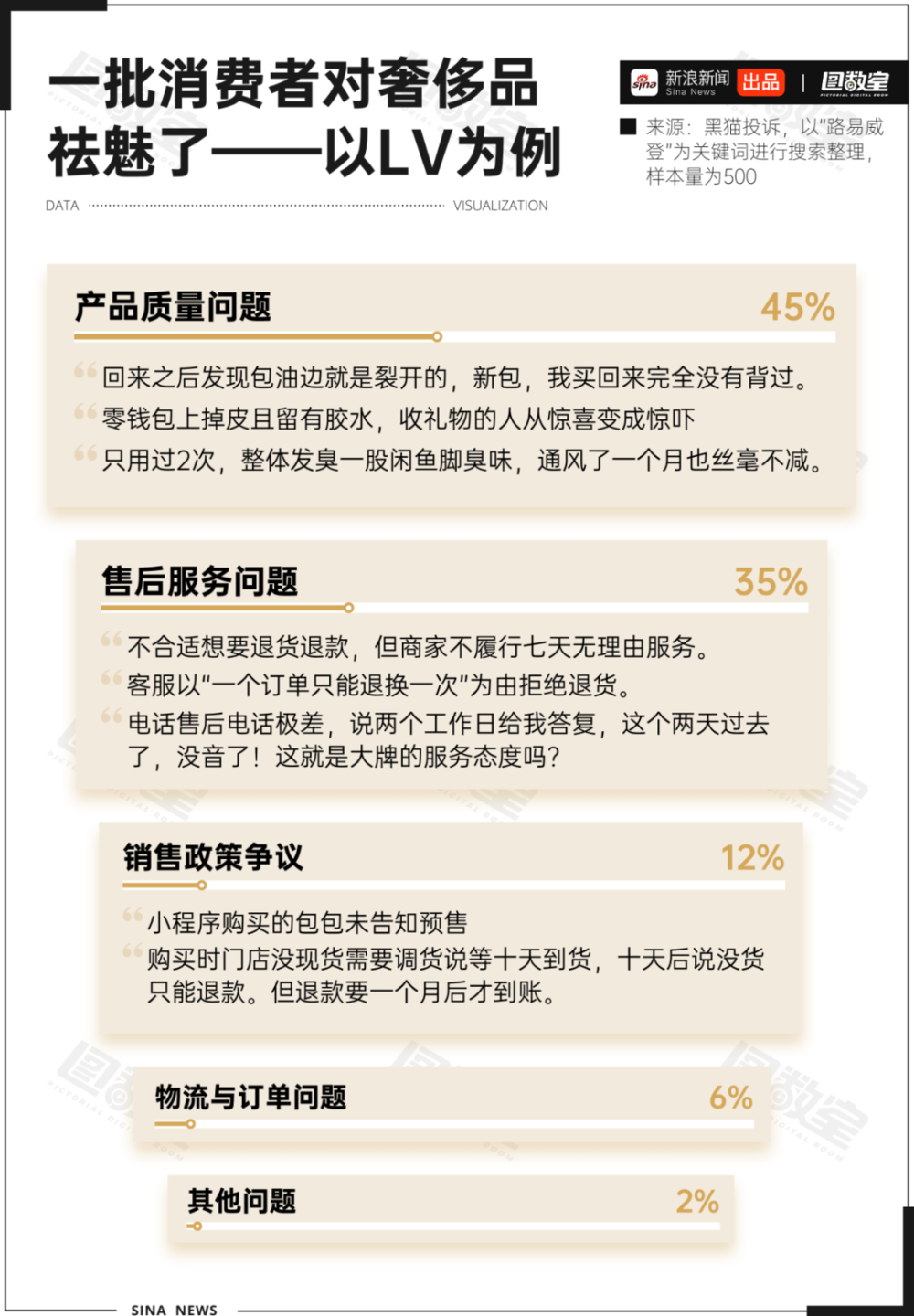 如今更为理性的消费者也逐渐对奢侈品祛魅,奢侈品不再代表着先锋的设计、一流的品质,而是逐渐拉垮的质量、糟糕的服务,不断增加的配货。 在黑猫投诉上,有关路易威登共599条投诉,其中产品质量问题占比45%,油边开裂、溢胶、发臭都是重灾区。