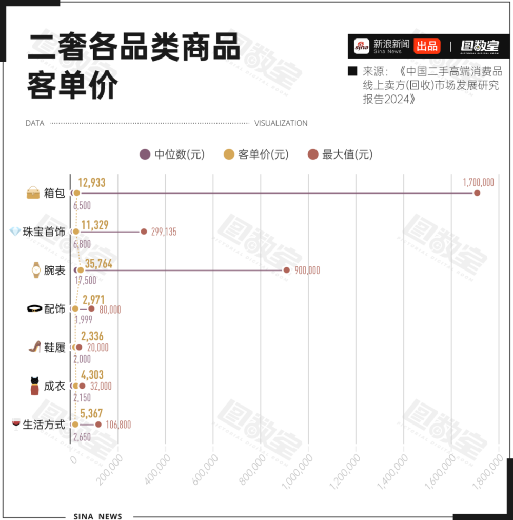 在中国奢侈品二手市场上,腕表的客单价是最高的,达到35764元;箱包和珠宝首饰为10000元左右,其他品类不到万元。并且,整体来看,商品的客单价和中位数差距较大,说明这些品类中既有普通商品,也有极高端的商品,价格差异很大。 特别是箱包,最大值达到了170万元,远高于其他品类。说明在二手市场上,箱包的高端商品非常受欢迎,特别是限量版或特殊设计的包。